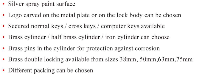 In conclusion, our High Security Padlock provides convenience, tamper resistance, and key control, making it the best choice for anyone who needs maximum security. With a 5-year guarantee, pin tumbler structure, multiple finishes, all sizes available, and customized logos accepted, you can be sure that you are getting the best product on the market.